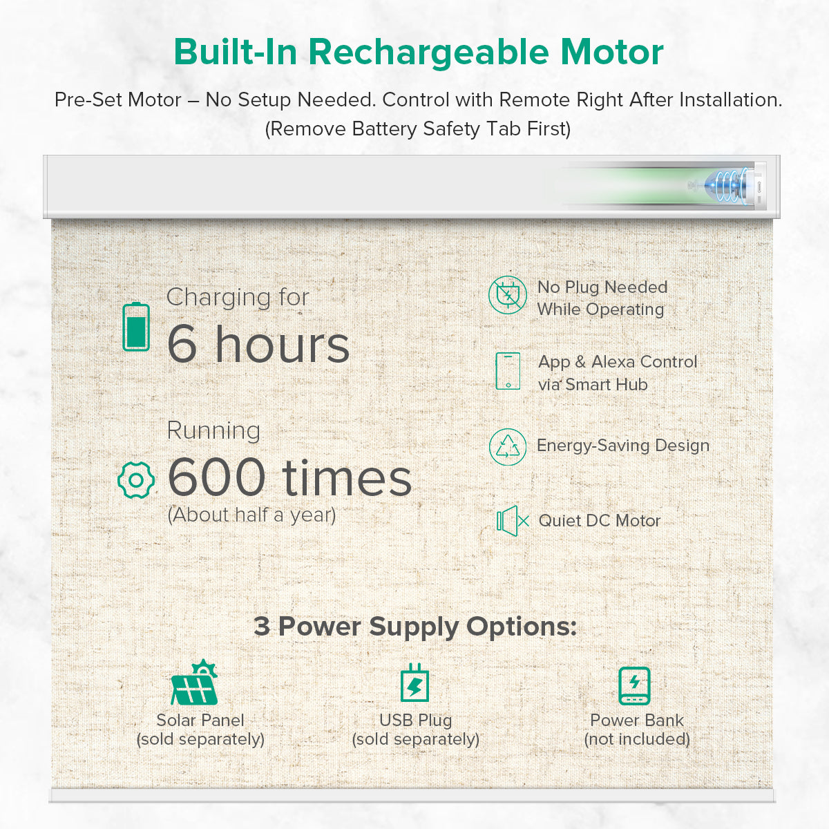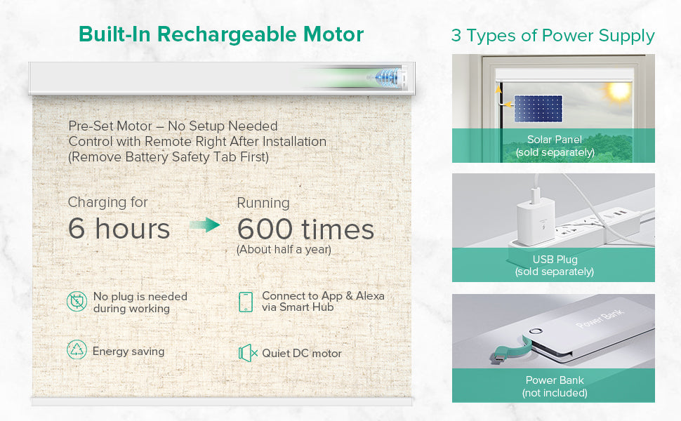 Pre-programmed for easy setup—just remove the remote’s battery tab to start using your shades. For hard-to-reach windows, an optional solar panel (sold separately) offers hassle-free charging. Note: One panel supports one shade.