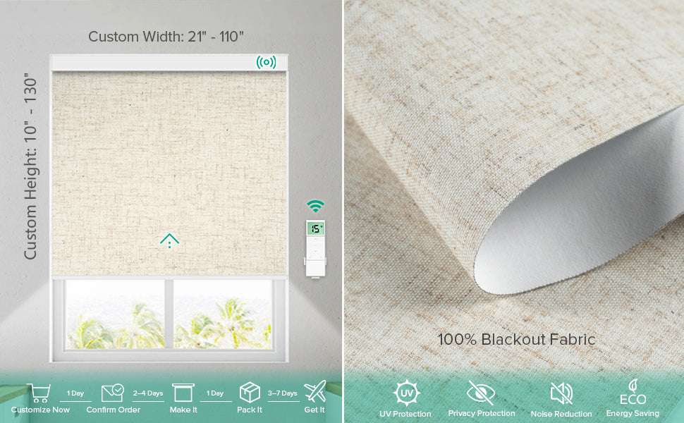 This motorized blackout roller shade is exactly what I needed for my living room. The textured fabric gives it a refined look, and it blocks all the sunlight during the day. The motor is quiet, and I love that I can control it with the remote. Super happy with this purchase!