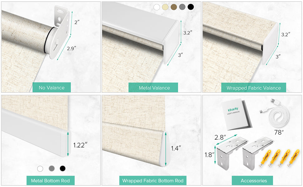 Choose no valance for a sleek look, a metal valance in 5 colors for extra blackout, or a wrapped fabric valance for a polished finish. Bottom rods come in metal (3 colors) or wrapped fabric to match your shade.