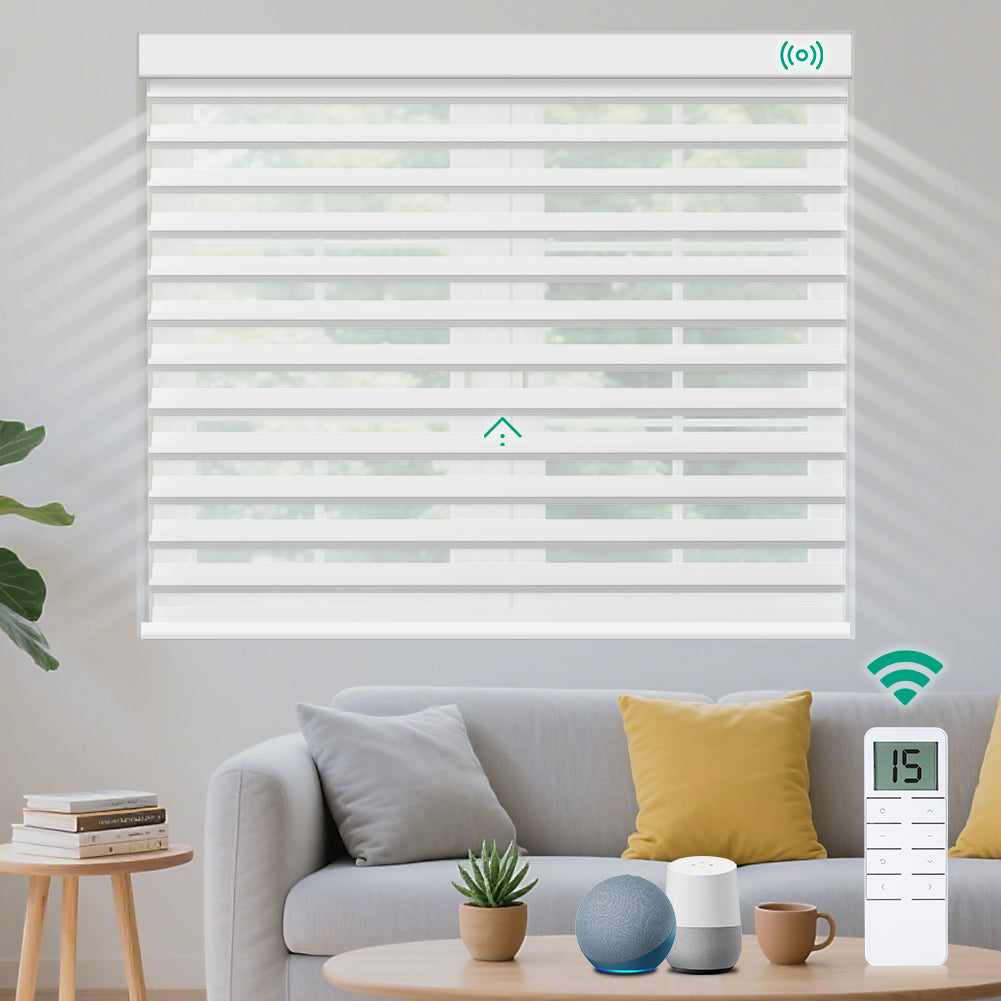 These motorized blackout shades are perfect! The sheer fabric creates a soft light, and the blackout feature gives me total privacy. The motor is quiet, and I love controlling them with the remote.