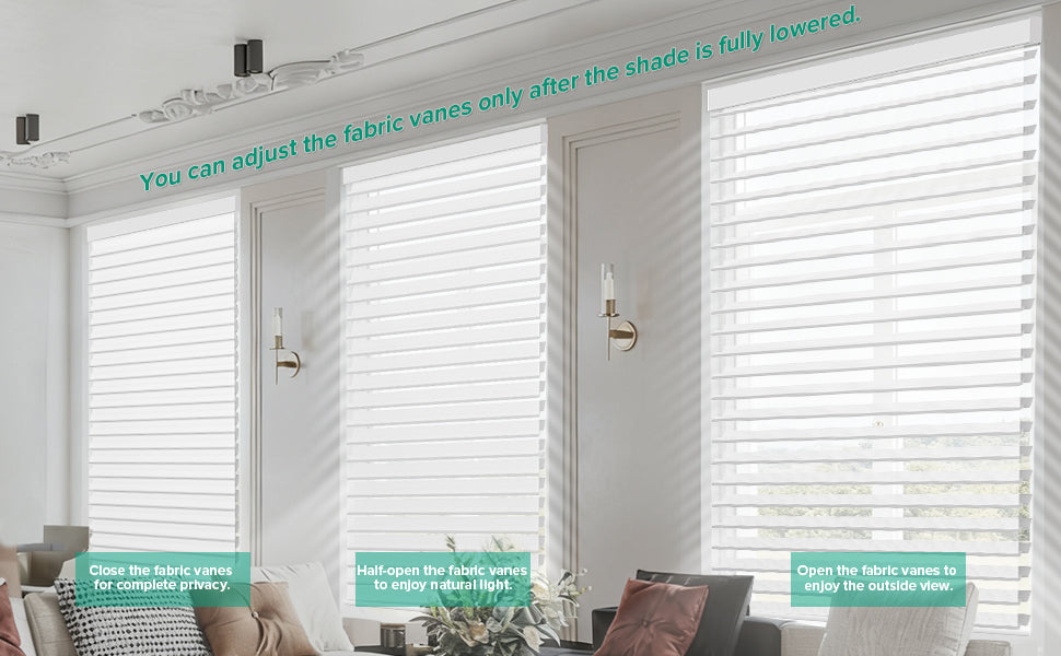 Adjust the fabric vanes only when the shade is fully lowered—fully closed for complete privacy, partially open for soft, diffused light, or fully open to enjoy sunlight and the outside view.