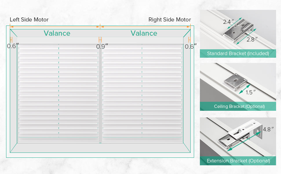 A small gap between the fabric and valance ends is normal. For side-by-side blinds, expect about a 0.9" gap even if the valances touch. Each shade includes all necessary brackets and accessories for easy installation.