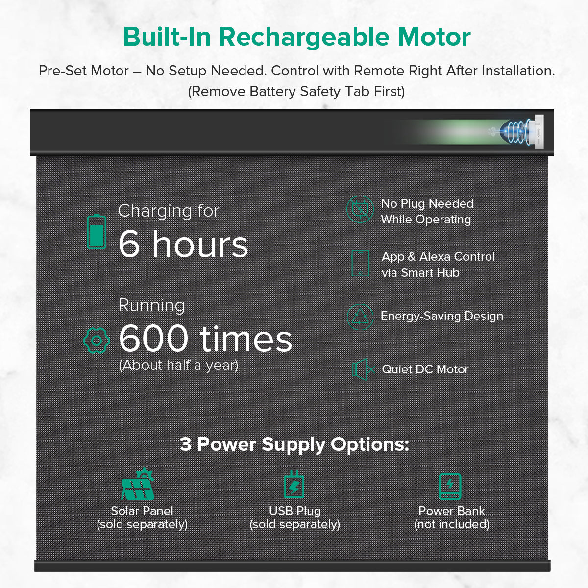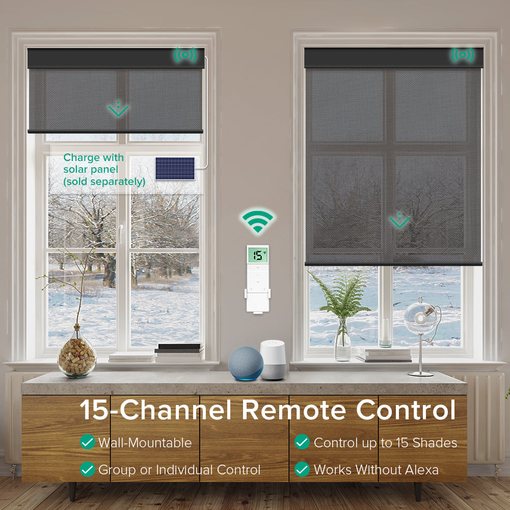 Pre-programmed for easy setup—just remove the remote’s battery tab to start using your shades. For hard-to-reach windows, an optional solar panel (sold separately) offers hassle-free charging. Note: One panel supports one shade.