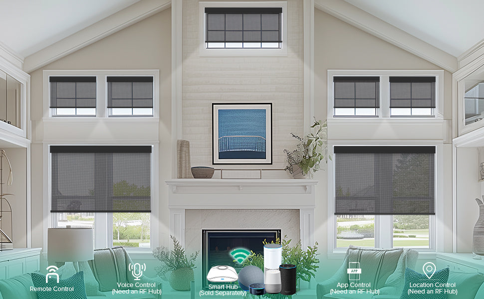 Motorized Light-Filtering Roller Shades – Control with remote or voice via Alexa & Google Assistant (RF Hub required). Made with fireproof fabric, these rechargeable blinds offer custom sizing and soft light filtering for a modern, safe design.