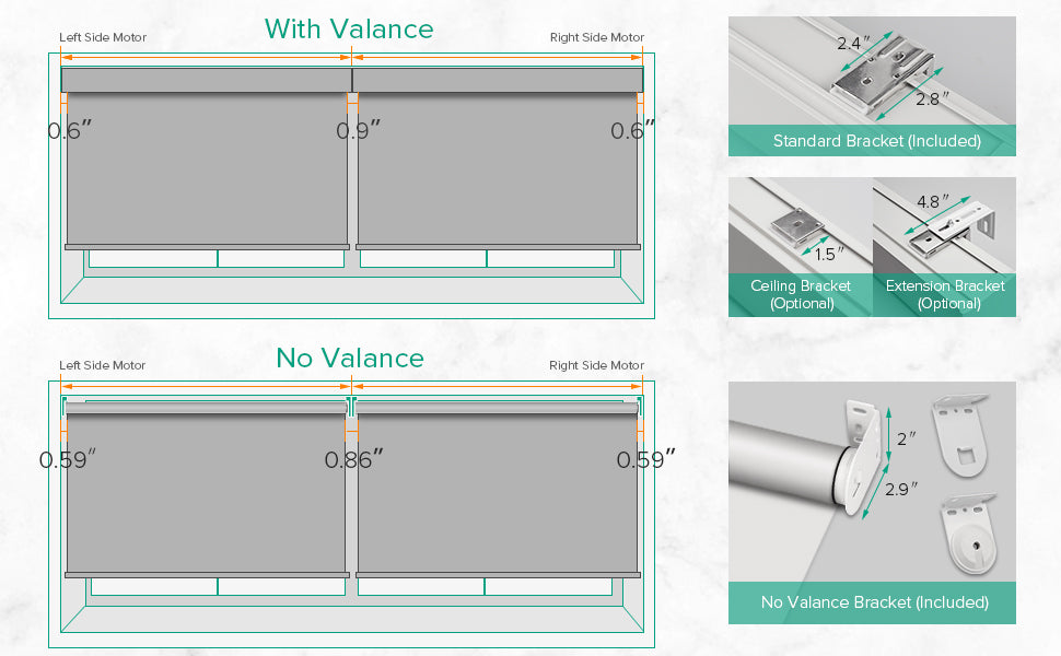 Choose no valance for a sleek look, a metal valance in 5 colors for extra blackout and modern style, with bottom rods available in metal (3 colors) for a clean, contemporary finish.