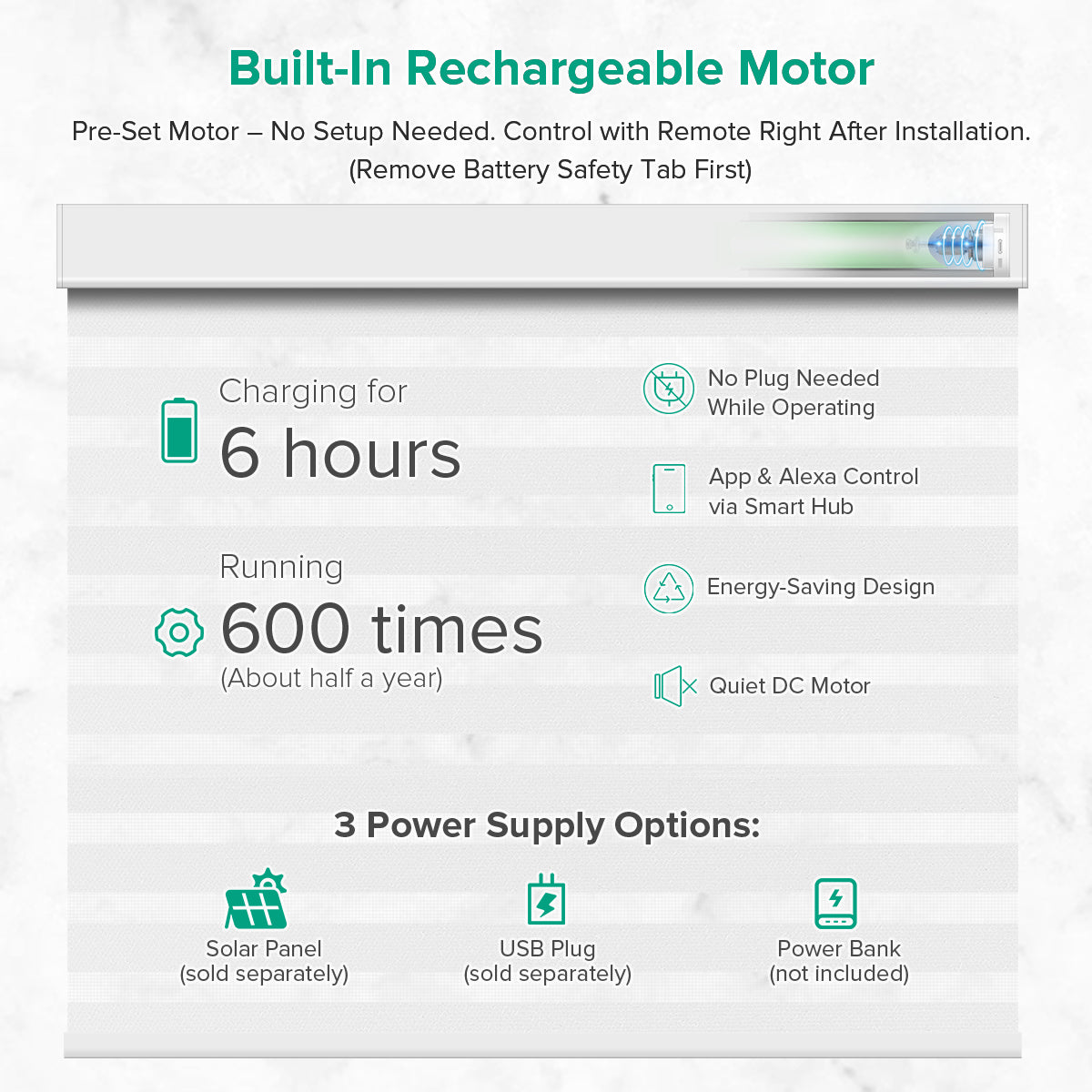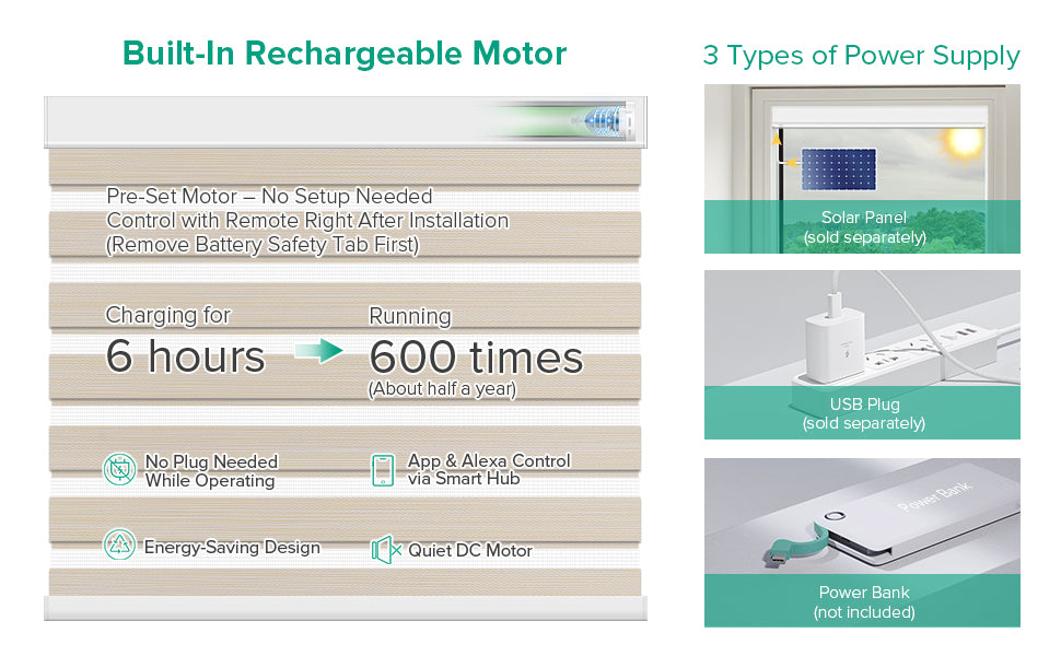 Pre-programmed for easy setup—just remove the remote’s battery tab to start using your shades. For hard-to-reach windows, an optional solar panel (sold separately) offers hassle-free charging. Note: One panel supports one shade.