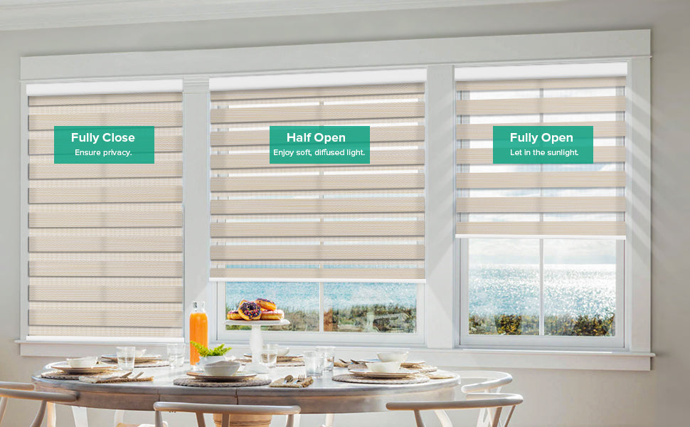 Adjust the fabric bands to your preference—fully closed for complete privacy, partially open for soft, diffused light, or fully open to let in sunlight and enjoy the view.