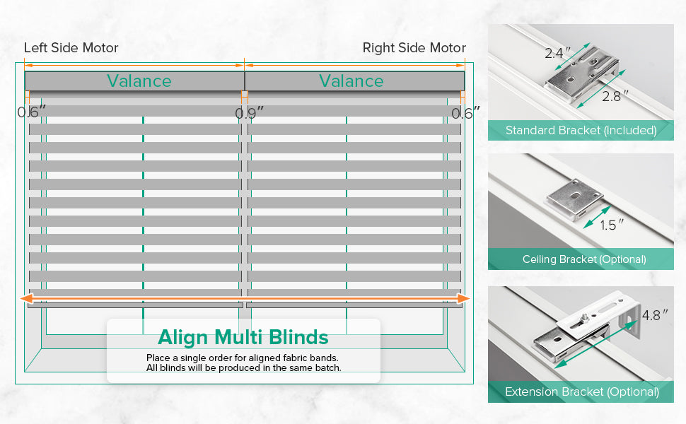 To ensure aligned fabric bands, order all zebra blinds in a single batch. Each blind comes with a standard bracket for installation, with optional ceiling brackets for inside mounts (1.5"–2.4" frame depth) or extension brackets (up to 4.8") for extra clearance when needed.